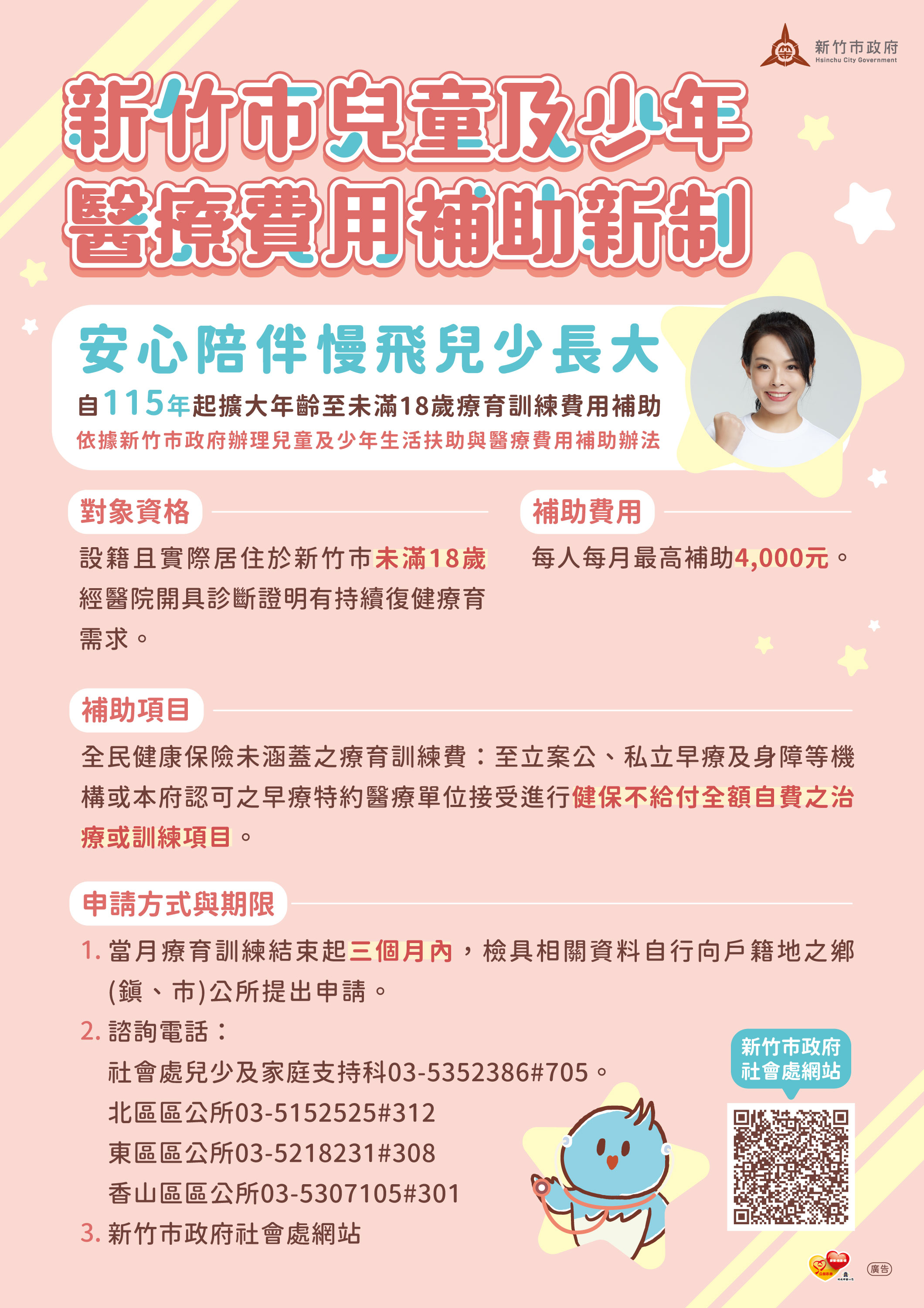 慢飛兒少不害怕,新竹市政府陪伴你長大!為保障早期療育兒童及家庭權益,自115年起新竹市兒童及少年醫療補助新制上路。社會處表示,新制調整原本的療育訓練補助費年齡限制,放寬至未滿18歲全民健康保險未涵蓋的療育訓練費,讓療育需求可以安心陪伴兒少慢慢長大。