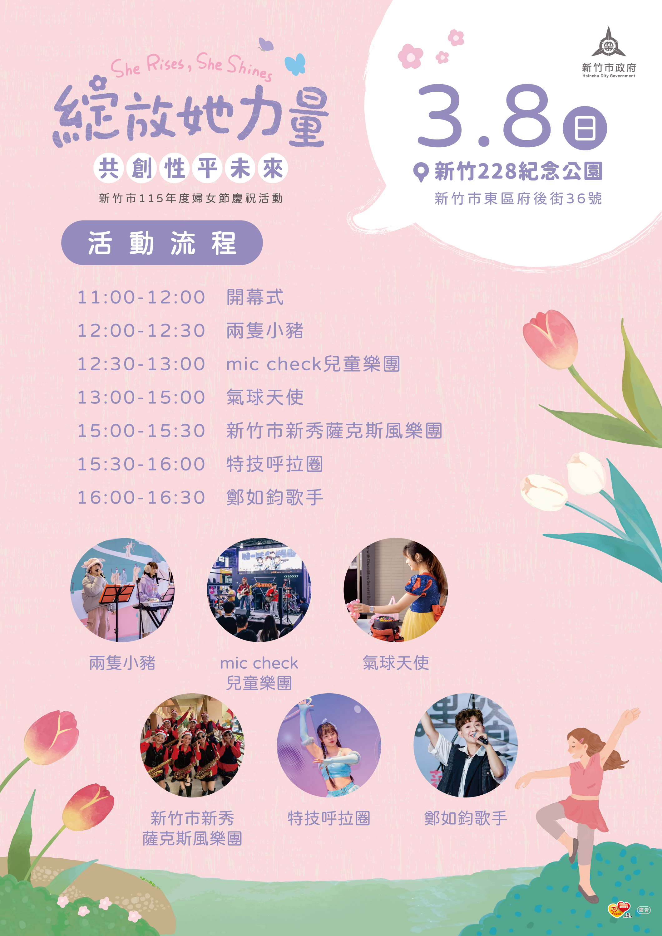 國際婦女節即將到來,新竹市政府將於3月8日11時至17時,在新竹228紀念公園舉辦「綻放她力量-共創性平未來」115年婦女節慶祝活動,將結合姊妹市集、舞台表演、療癒體驗活動及首度推出的「女路」走讀行程,邀請市民朋友攜家帶眷一同參與,共度溫馨愉快的婦女節時光。