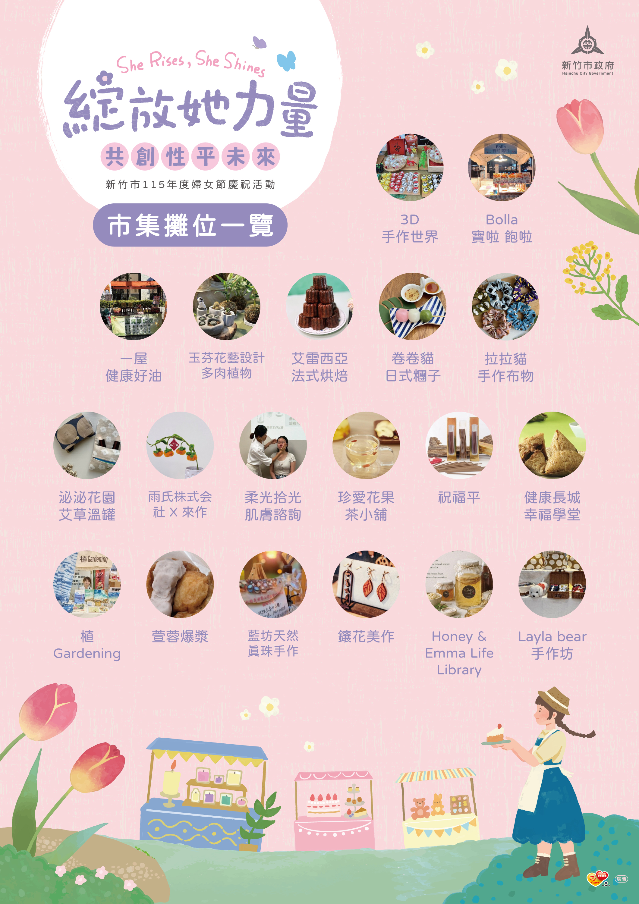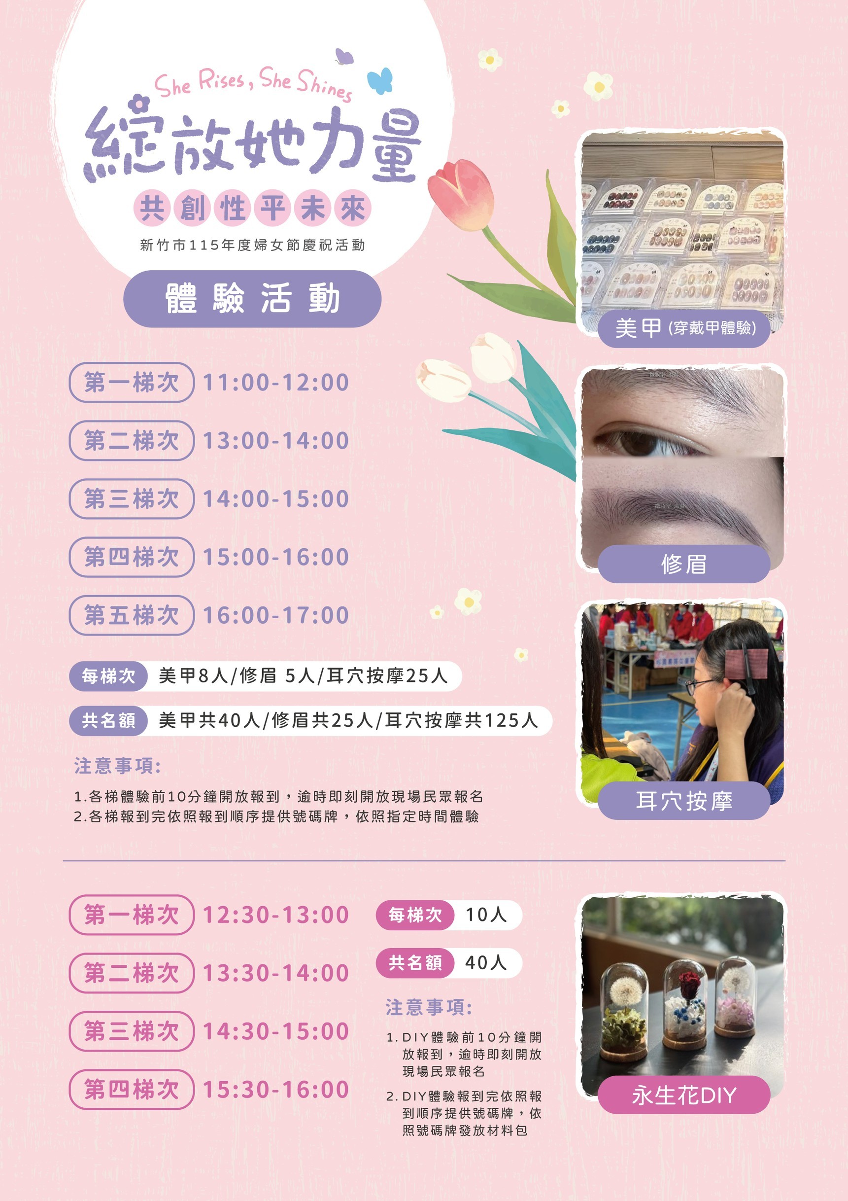 社會處長黃佳婷表示,今年婦女節以「綻放她力量-共創性平未來」為主題,期望呈現以女性為主軸的多元慶祝活動,現場特別邀請女性創業品牌、文創手作及輕食市集進駐,並規劃「美感教室」、「療癒紓壓」及「手作體驗」等免費體驗活動,讓女性在參與活動的同時,也能好好照顧自己、放鬆身心。